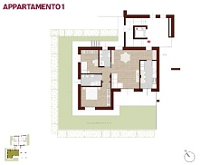 Appartamento 1: composto da tre locali, cucina abitabile e doppi servizi finestrati oltre a ampio giardino privato e patio di mq. 120. Cantina abbinata inclusa nel prezzo. Possibilità di box singoli/doppi o posti auto.